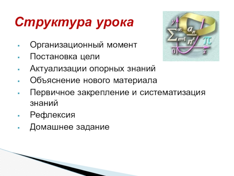 Организационный моментПостановка целиАктуализации опорных знанийОбъяснение нового материалаПервичное закрепление и систематизация знанийРефлексияДомашнее заданиеСтруктура урока