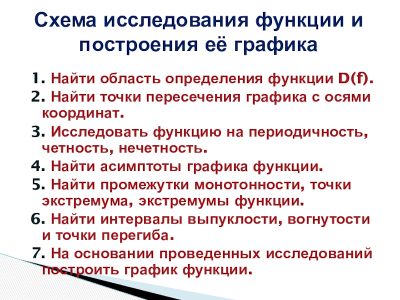 1. Найти область определения функции D(f).2. Найти точки пересечения графика с осями координат.3. Исследовать функцию на периодичность,
