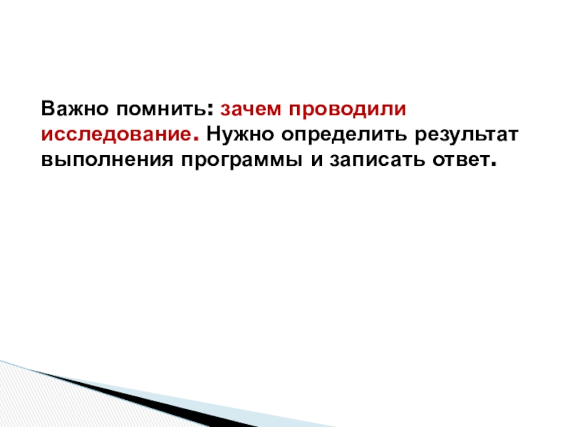 Слайд 29Важно помнить: зачем проводили исследование. Нужно определить результат выполнения программы и