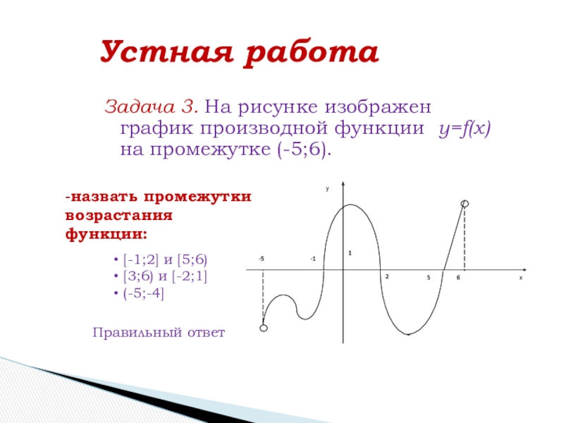 Устная работаЗадача 3. На рисунке изображен график производной функции y=f(x) на промежутке (-5;6).-назвать промежутки возрастания функции: [-1;2]