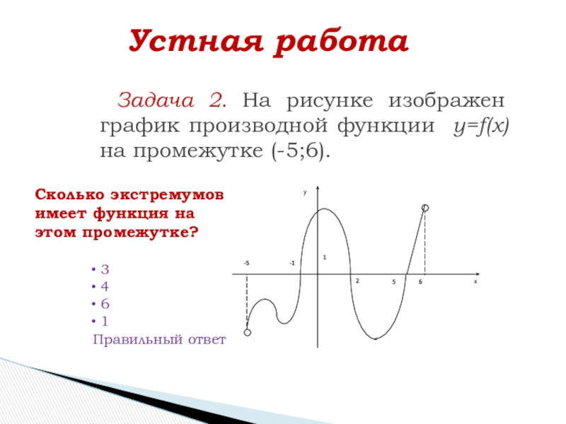 Устная работаЗадача 2. На рисунке изображен график производной функции y=f(x) на промежутке (-5;6).Сколько экстремумов имеет функция на