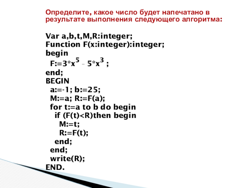Определите, какое число будет напечатано в результате выполнения следующего алгоритма: Var a,b,t,M,R:integer;Function F(x:integer):integer;begin F:=3*x5 – 5*x3 ;end;BEGIN