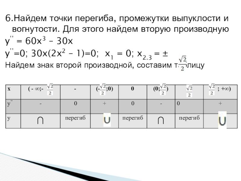 6.Найдем точки перегиба, промежутки выпуклости и вогнутости. Для этого найдем вторую производнуюy’’ = 60x3 – 30xy’’=0; 30x(2x2