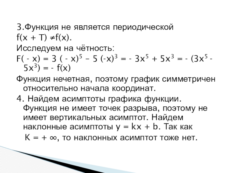 3.Функция не является периодической f(x + T) ≠f(x).Исследуем на чётность:F( - x) = 3 ( - x)5