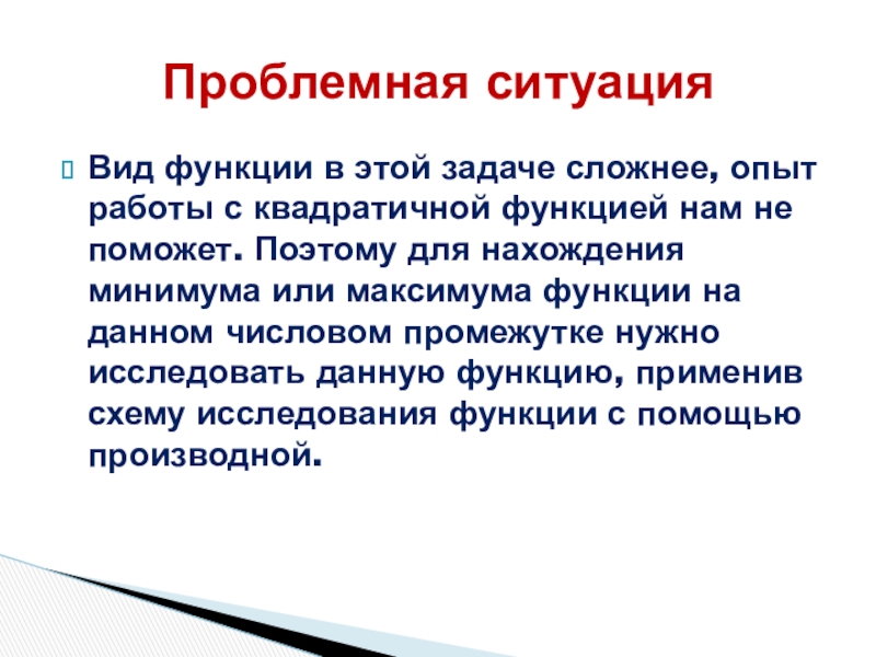 Слайд 15Вид функции в этой задаче сложнее, опыт работы с квадратичной функцией