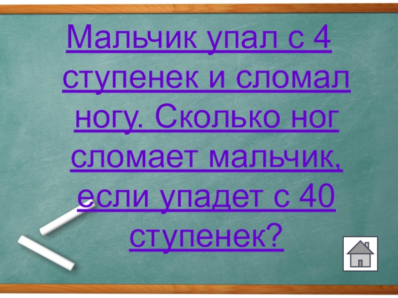 Слайд 29Мальчик упал с 4 ступенек и сломал ногу. Сколько ног сломает
