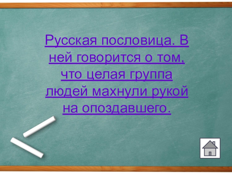 Русская пословица. В ней говорится о том, что целая группа людей махнули рукой на опоздавшего.