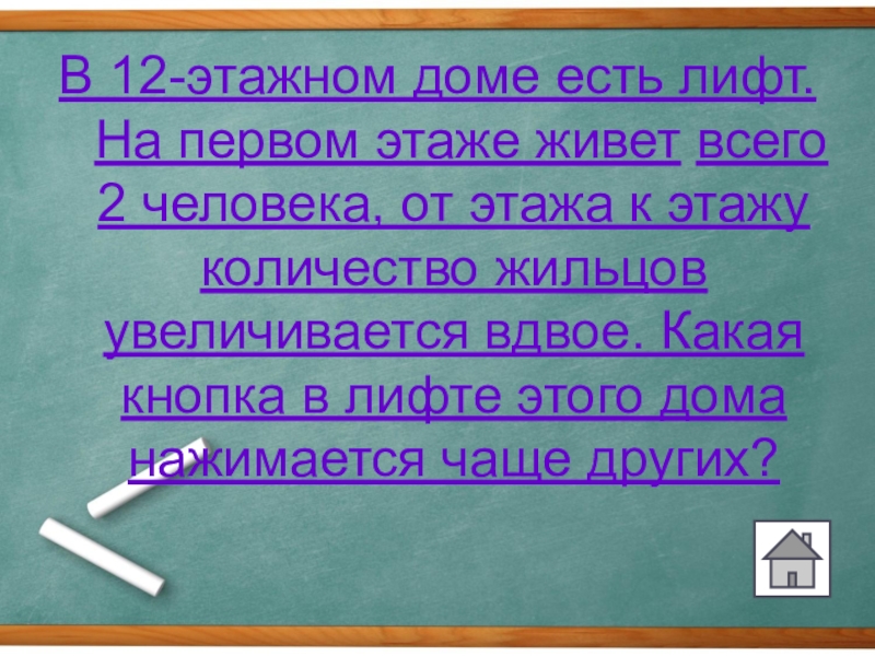 Слайд 28В 12-этажном доме есть лифт. На первом этаже живет всего 2