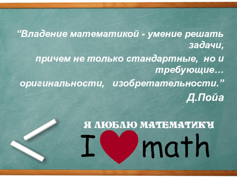 “Владение математикой - умение решать задачи,  причем не только стандартные,  но и требующие… оригинальности,   изобретательности.”Д.Пойа