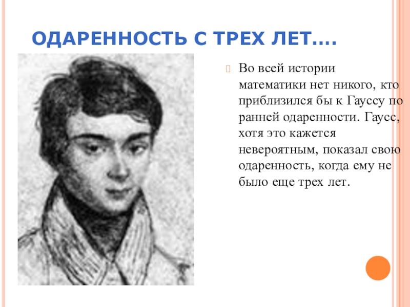 бы к Гауссу по ранней одаренности. Гаусс, хотя это кажется невероятным, показал свою одаренность, когда ему не было еще трех лет.