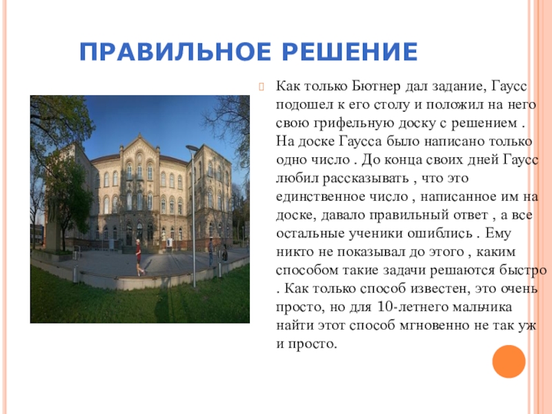 и положил на него свою грифельную доску с решением . На доске Гаусса было написано только одно число . До конца своих дней Гаусс любил рассказывать , что это единственное число , написанное им на доске, давало правильный ответ , а все остальные ученики ошиблись . Ему никто не показывал до этого , каким способом такие задачи решаются быстро . Как только способ известен, это очень просто, но для 10-летнего мальчика найти этот способ мгновенно не так уж и просто.