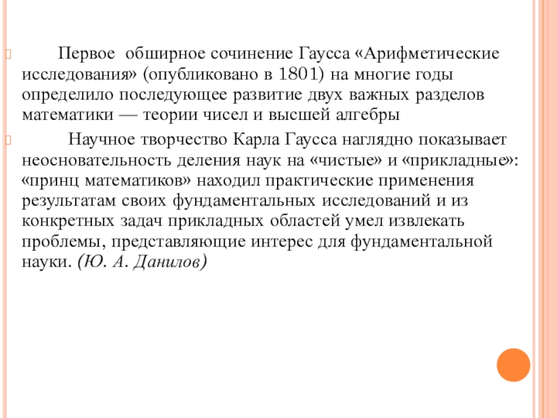(опубликовано в 1801) на многие годы определило последующее развитие двух важных разделов математики — теории чисел и высшей алгебры