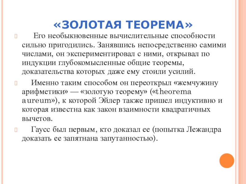 Именно таким способом он переоткрыл «жемчужину арифметики» — «золотую теорему» («theorema aureum»), к которой Эйлер также пришел индуктивно и которая известна как закон взаимности квадратичных вычетов.