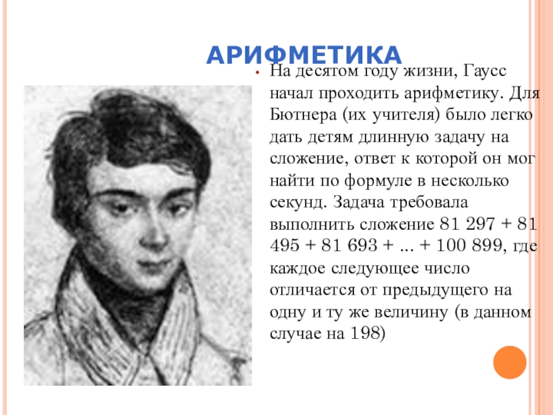 На десятом году жизни, Гаусс начал проходить арифметику. Для Бютнера (их