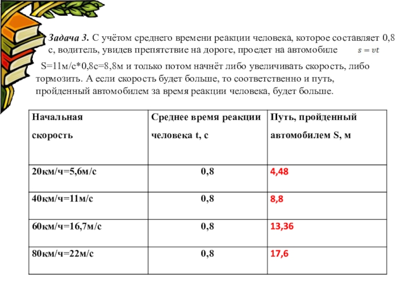 S=11м/с*0,8с=8,8м и только потом начнёт либо увеличивать скорость, либо тормозить. А если скорость будет больше, то соответственно и путь, пройденный автомобилем за время реакции человека, будет больше.