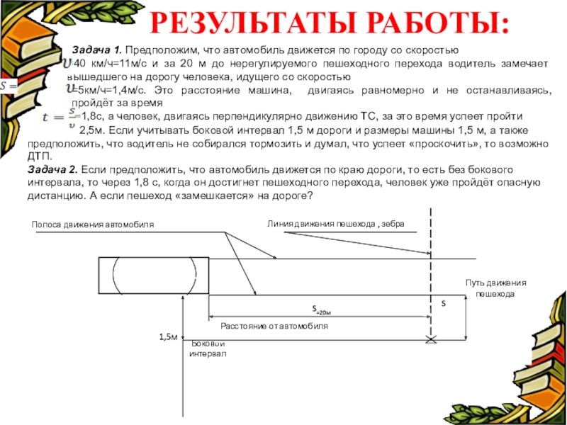 Задача 2. Если предположить, что автомобиль движется по краю дороги, то есть без бокового интервала, то через 1,8 с, когда он достигнет пешеходного перехода, человек уже пройдёт опасную дистанцию. А если пешеход «замешкается» на дороге?