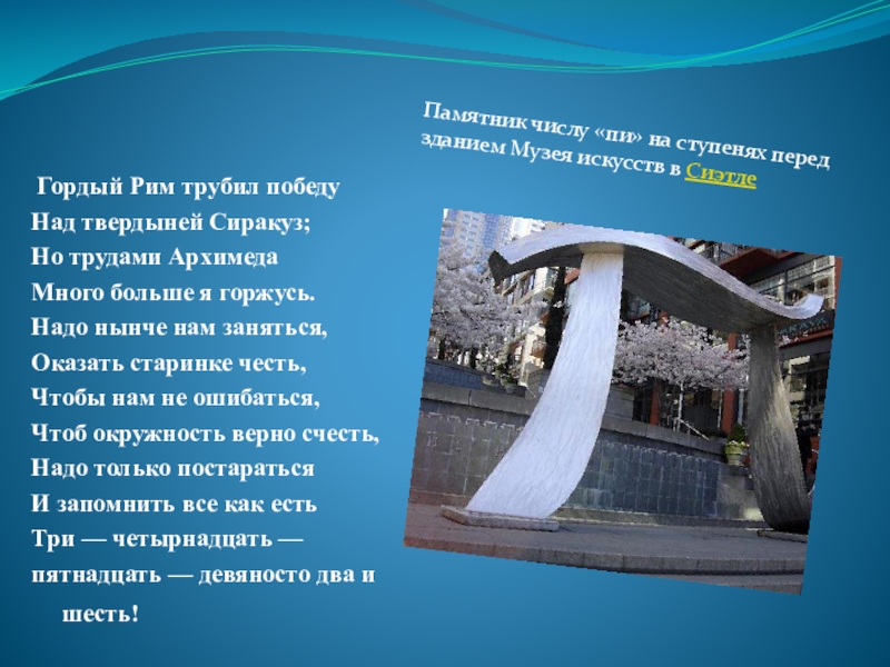 Памятник числу «пи» на ступенях перед зданием Музея искусств в Сиэтле