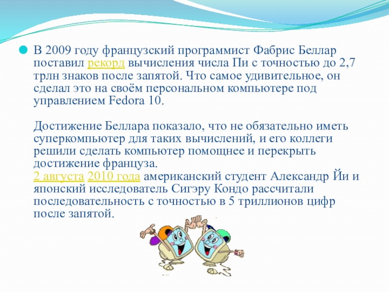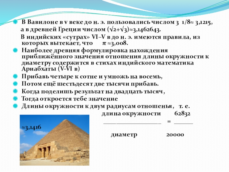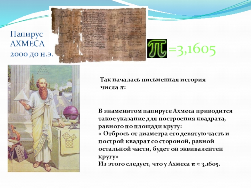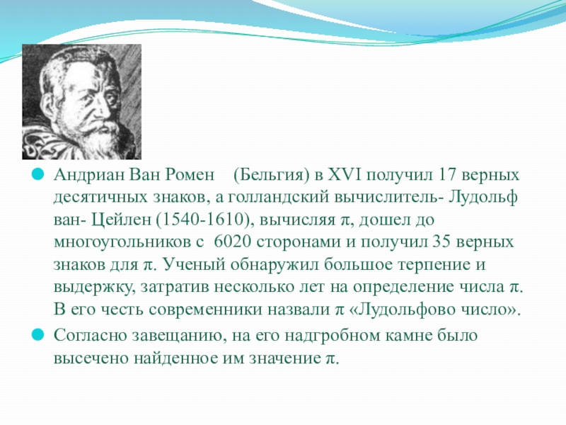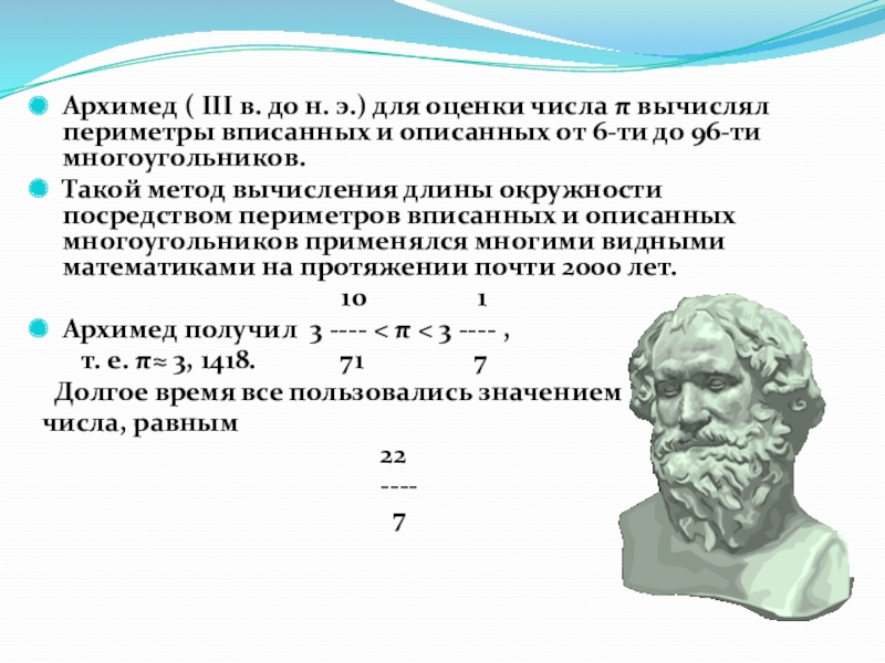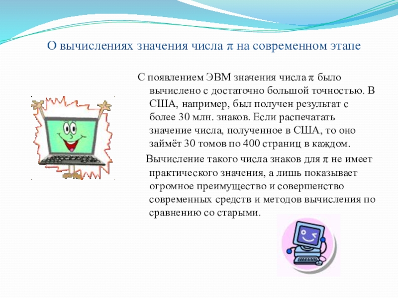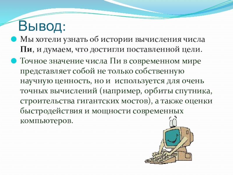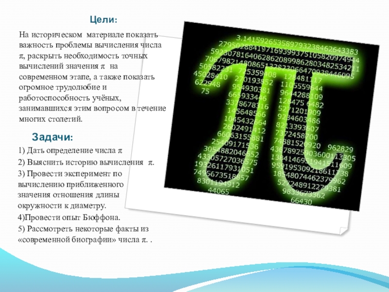 На историческом материале показать важность проблемы вычисления числа π, раскрыть необходимость точных вычислений значения π на современном этапе, а также показать огромное трудолюбие и работоспособность учёных, занимавшихся этим вопросом в течение многих столетий.