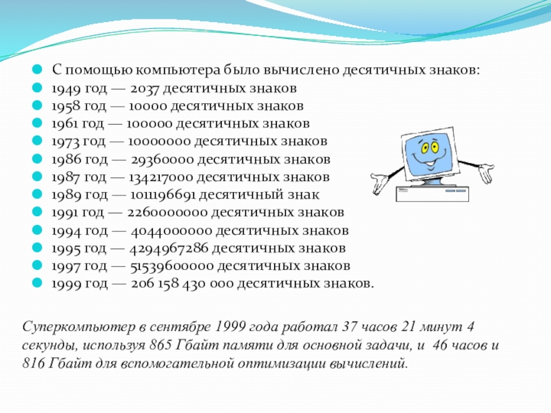 Суперкомпьютер в сентябре 1999 года работал 37 часов 21 минут 4 секунды, используя 865 Гбайт памяти для основной задачи, и 46 часов и 816 Гбайт для вспомогательной оптимизации вычислений.