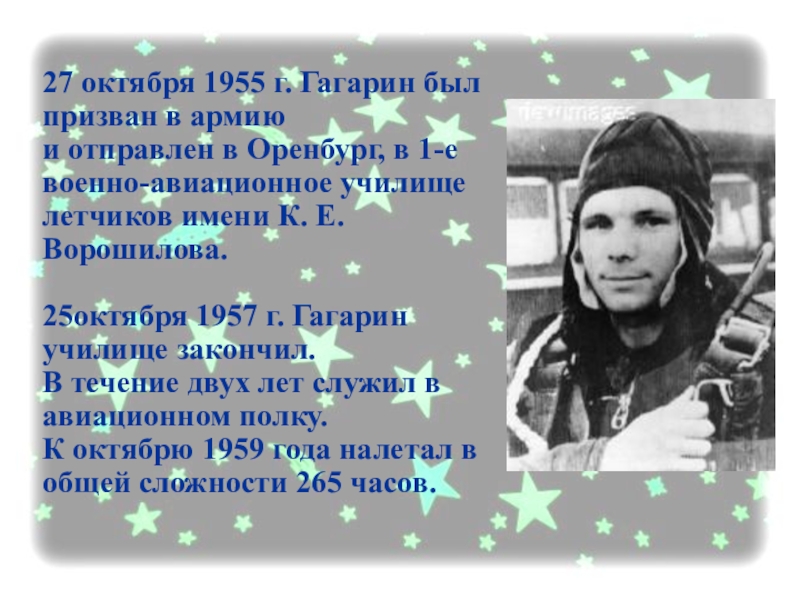 Слайд 2527 октября 1955 г. Гагарин был призван в армию