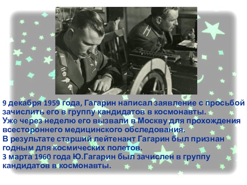 Слайд 269 декабря 1959 года, Гагарин написал заявление с просьбой зачислить его