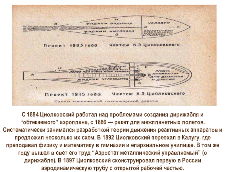 с 1886 — ракет для межпланетных полетов. Систематически занимался разработкой теории движения реактивных аппаратов и предложил несколько их схем. В 1892 Циолковский переехал в Калугу, где преподавал физику и математику в гимназии и епархиальном училище. В том же году вышел в свет его труд “Аэростат металлический управляемый” (о дирижабле). В 1897 Циолковский сконструировал первую в России аэродинамическую трубу с открытой рабочей частью.