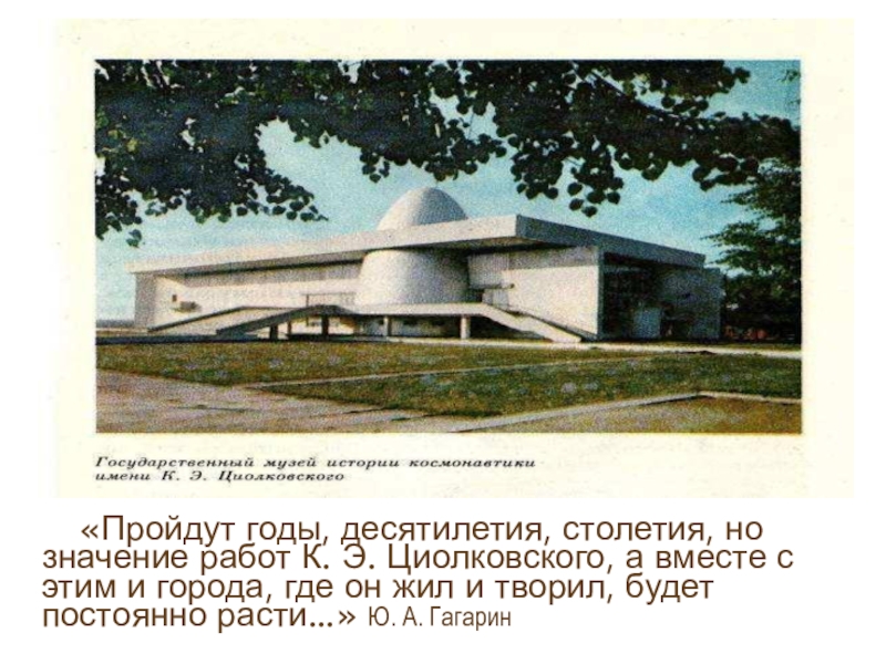 Слайд 13В 1967 Г. В КАЛУГЕ БЫЛ ОТКРЫТ ГОСУДАРСТВЕННЫЙ МУЗЕЙ ИСТОРИИ КОСМОНАВТИКИ