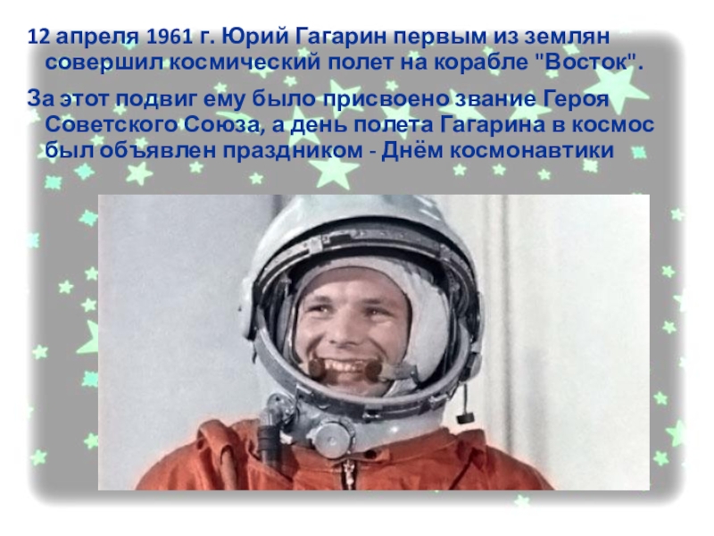 За этот подвиг ему было присвоено звание Героя Советского Союза, а день полета Гагарина в космос был объявлен праздником - Днём космонавтики