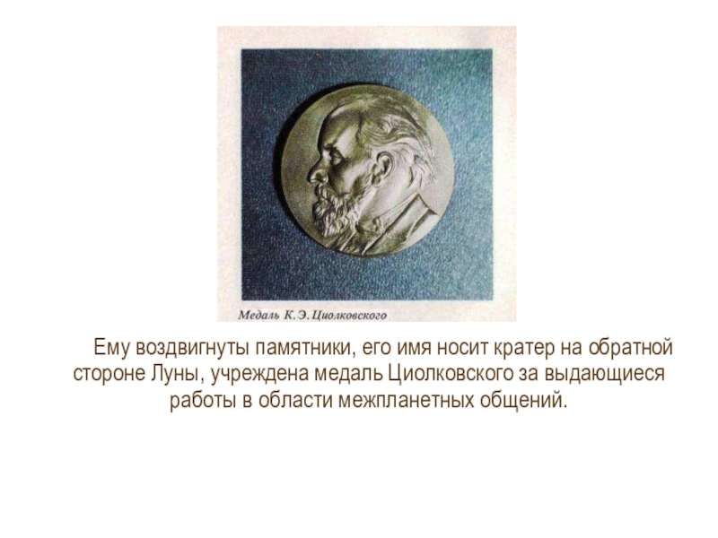 Слайд 15Ему воздвигнуты памятники, его имя носит кратер на обратной стороне Луны,