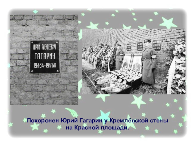 Слайд 29Похоронен Юрий Гагарин у Кремлёвской стены