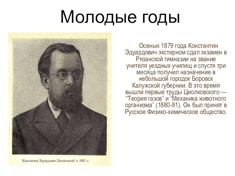 на звание учителя уездных училищ и спустя три месяца получил назначение в небольшой городок Боровск Калужской губернии. В это время вышли первые труды Циолковского — “Теория газов” и “Механика животного организма” (1880-81). Он был принят в Русское Физико-химическое общество.