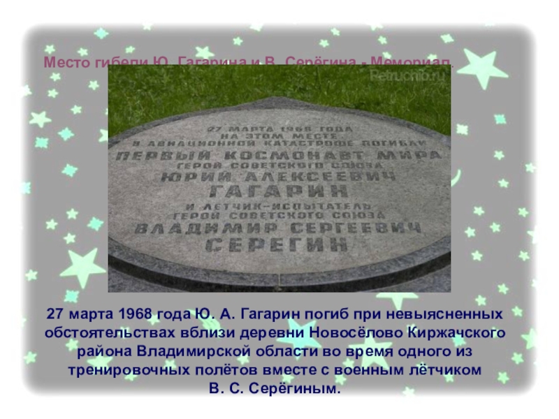 года Ю. А. Гагарин погиб при невыясненных обстоятельствах вблизи деревни Новосёлово Киржачского района Владимирской области во время одного из тренировочных полётов вместе с военным лётчиком