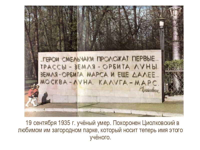 Слайд 1119 сентября 1935 г. учёный умер. Похоронен Циолковский в любимом им