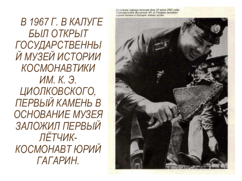 ИМ. К. Э. ЦИОЛКОВСКОГО, ПЕРВЫЙ КАМЕНЬ В ОСНОВАНИЕ МУЗЕЯ ЗАЛОЖИЛ ПЕРВЫЙ ЛЁТЧИК-КОСМОНАВТ ЮРИЙ ГАГАРИН.