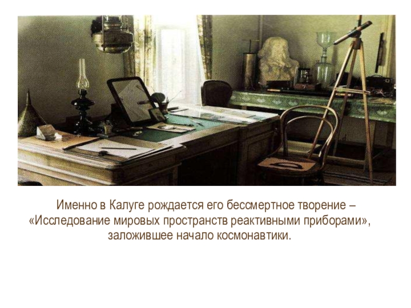 Слайд 9Именно в Калуге рождается его бессмертное творение – «Исследование мировых пространств