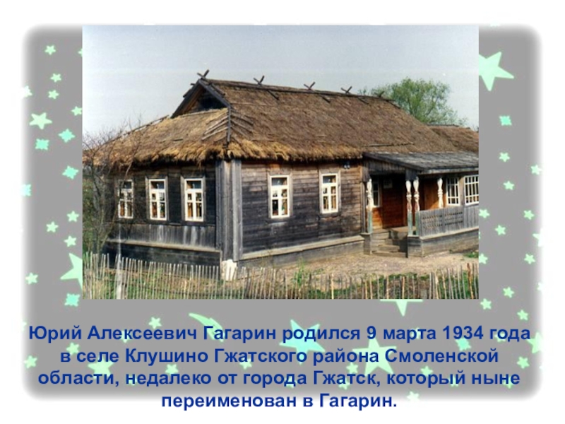 Слайд 24Юрий Алексеевич Гагарин родился 9 марта 1934 года в селе Клушино