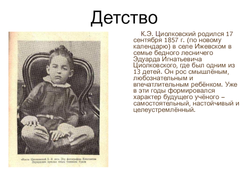 селе Ижевском в семье бедного лесничего Эдуарда Игнатьевича Циолковского, где был одним из 13 детей. Он рос смышлёным, любознательным и впечатлительным ребёнком. Уже в эти годы формировался характер будущего учёного – самостоятельный, настойчивый и целеустремлённый.