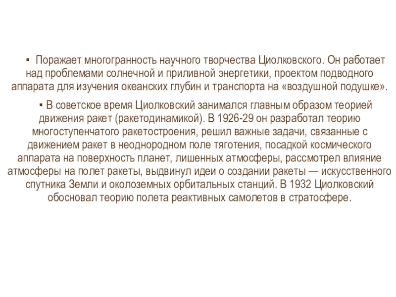 Слайд 10▪ Поражает многогранность научного творчества Циолковского. Он работает над проблемами солнечной