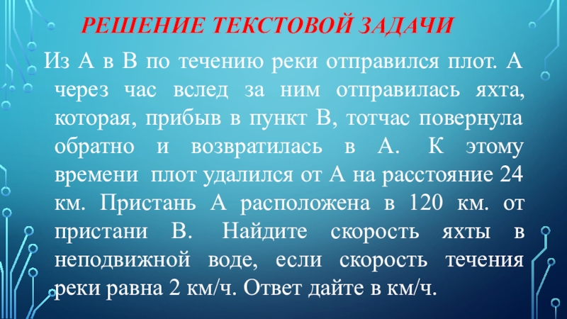 Решение текстовой задачиИз А в В по течению реки отправился плот. А через час вслед за ним