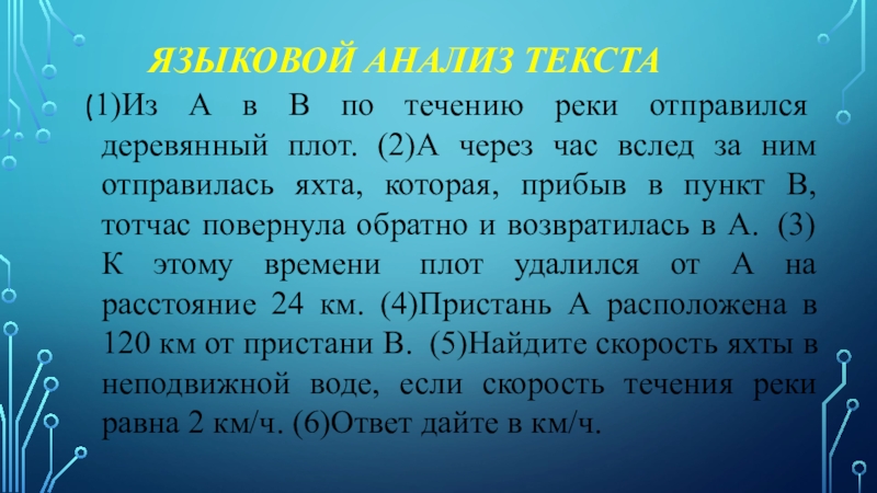 Языковой анализ текста(1)Из А в В по течению реки отправился деревянный плот. (2)А через час вслед за