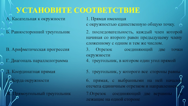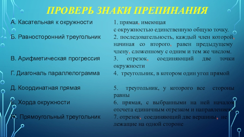 Слайд 2Касательная к окружности, равносторонний треугольник, арифметическая прогрессия, диагональ параллелограмма,