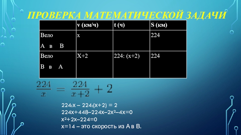Проверка математической задачи 224:х – 224:(х+2) = 2 224х+448–224х–2х²–4х=0 х²+2х–224=0 х=14 – это скорость из А в В.