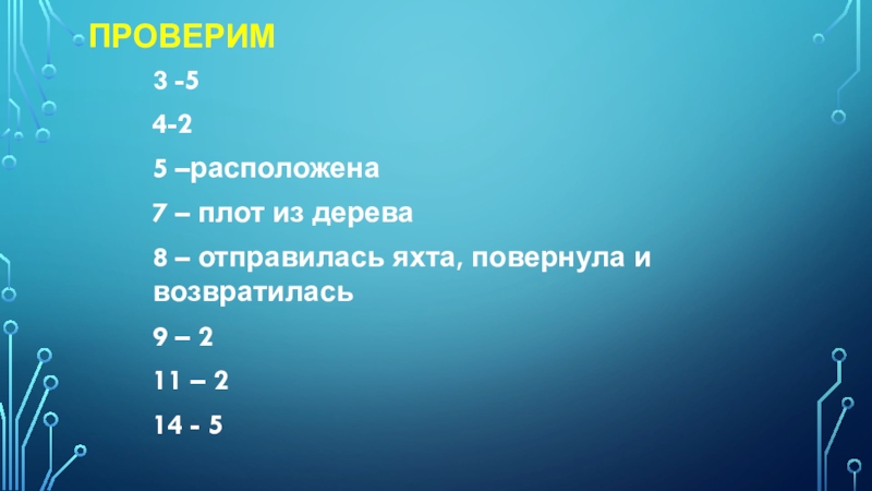 Проверим 3 -54-25 –расположена7 – плот из дерева8 – отправилась яхта, повернула и возвратилась9 – 211 –