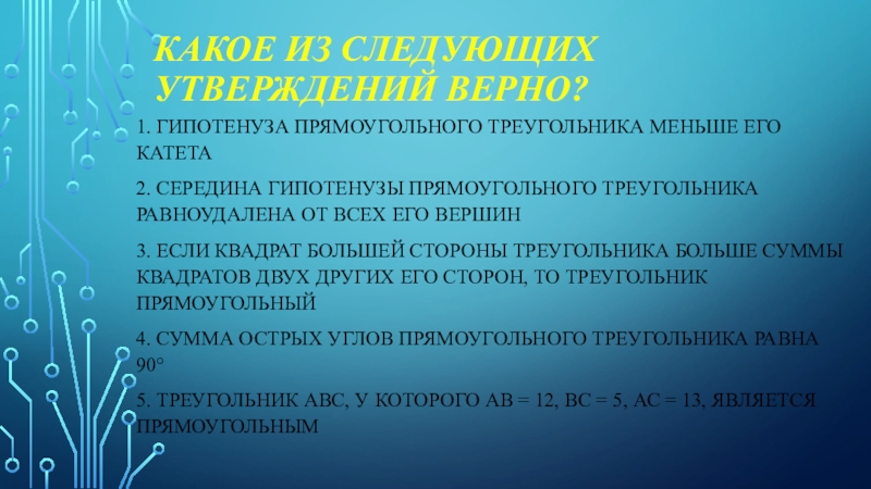 Какое из следующих  утверждений верно?1. Гипотенуза прямоугольного треугольника меньше его катета2. Середина гипотенузы прямоугольного треугольника равноудалена