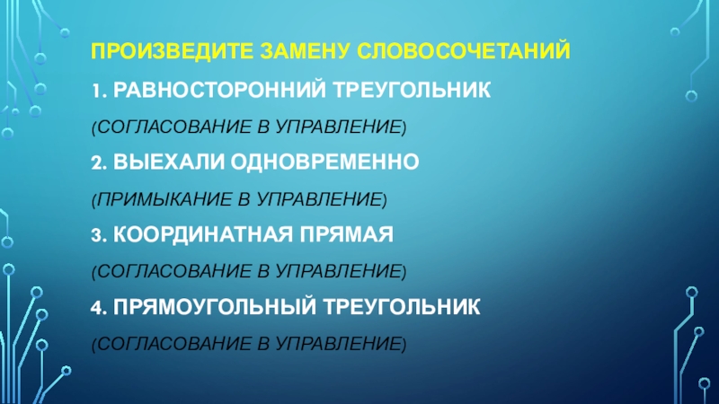 Слайд 3 Произведите замену словосочетаний 1. Равносторонний треугольник (согласование в управление) 2. Выехали одновременно (примыкание