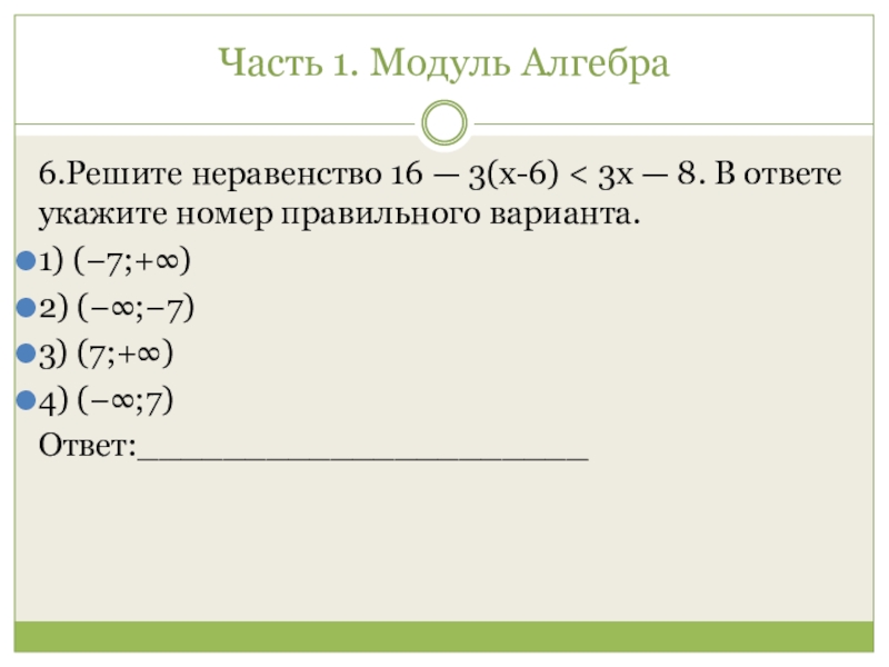 Часть 1. Модуль Алгебра 6.Решите неравенство 16 — 3(x-6) < 3x — 8. В ответе укажите номер