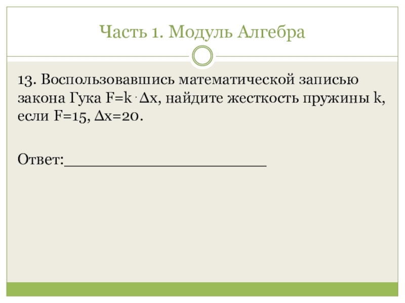 Часть 1. Модуль Алгебра 13. Воспользовавшись математической записью закона Гука F=k⋅Δx, найдите жесткость пружины k, если F=15,