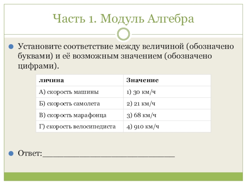 Часть 1. Модуль Алгебра Установите соответствие между величиной (обозначено буквами) и её возможным значением (обозначено цифрами).Ответ:_________________________