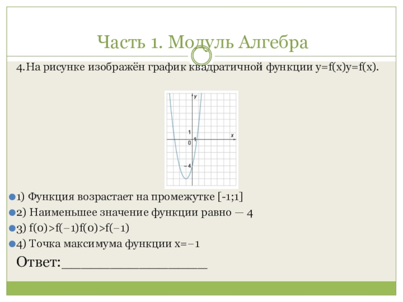 Часть 1. Модуль Алгебра 4.На рисунке изображён график квадратичной функции y=f(x)y=f(x). 1) Функция возрастает на промежутке [-1;1]2) Наименьшее