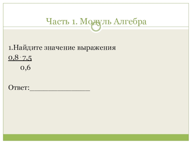 Часть 1. Модуль Алгебра 1.Найдите значение выражения0,8⋅7,5    0,6Ответ:_____________